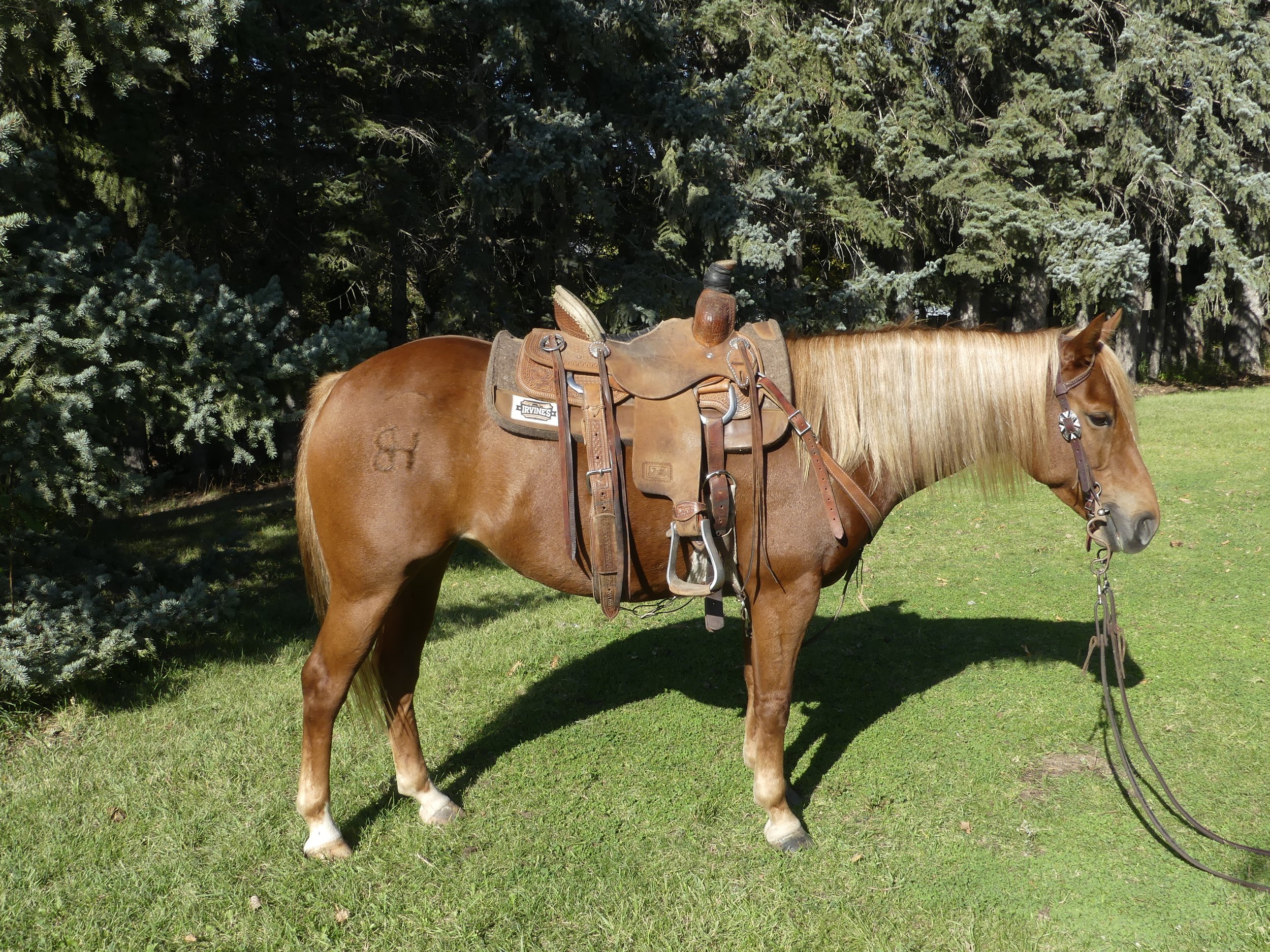 Flaxy is a 5 yr old heel horse we raised ourselves. He stands 14.3 and built like a tank. Flaxy is a really user friendly heel horse that catches your eye with his smooth lope and big stops. Is more suitable for the lower numbers but also has won money at the slides. Been hauled mainly by a #4 heeler. Flaxy can be used outside for anything from ranch chores to trail riding and takes everything in stride. He is a quiet and willing kind of horse that the whole family can ride.