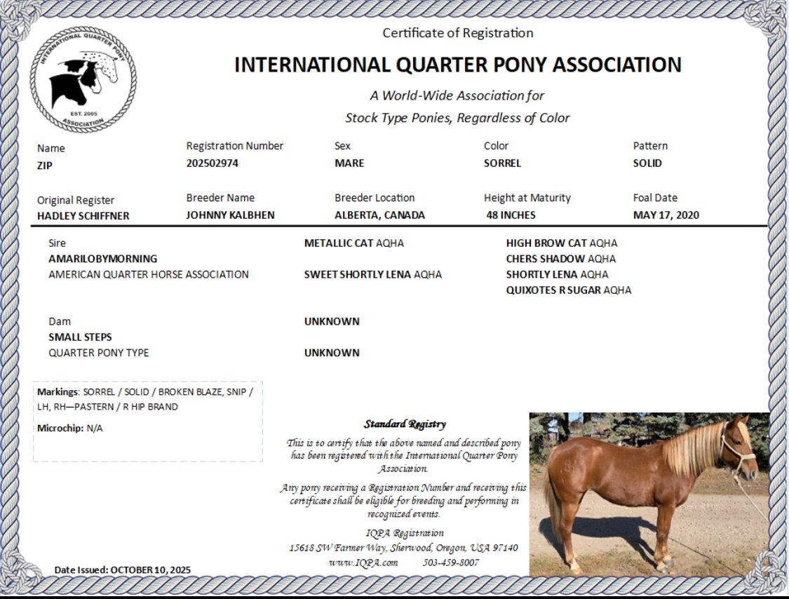 Zip is a 2020 IQPA quarter horse pony standing at 12 hands and cute as a button. She is a jack of all trades with a big personality and an even bigger heart. This is the ultimate all-round pony that’s broke and competitive in the barrels, poles, goats, breakaway and heeling. She has been hauled everywhere, including all the jr and high school rodeos and a bunch of other rodeos along the trail. Zip has a big motor and is ready to go win in any event. She also has proven ranch work including dragging calves to the fire, doctoring cattle, sorting and just everyday ranch work. Also great for trail riding, put her head down and walk. Zip is so sweet to be around, in your pocket type of pony. With her flashy color and cute build, she turns heads everywhere she goes. She’s easy to catch, bath, clip and has great manners. Whether it’s in the rodeo pen, working outside, or on the trail she is perfect for the job.