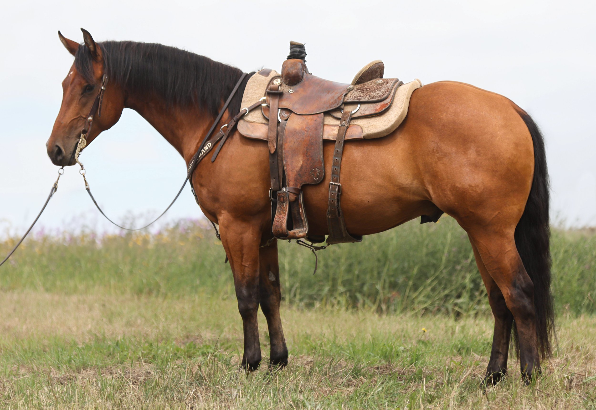 We have enjoyed "Lew" as a dependable head horse. He is easy to ride and rope on, allowing headers to focus on their roping and the steer's handles. He naturally rates the steer, providing a consistent look every time. He will run to the hip or stay a coil back, depending on your style. He handles steers with ease, keeping the steer’s head up for a crisp, professional face that helps the heeler. He is no dead-head but is forgiving for a seasoned #4 roper. He always walks back to the box with no funny business. "Lew" is smooth to ride, suitable for trail rides, or work around the ranch if needed. He is the same consistent horse at town as he is at home. He is easy to handle—shoes, clips, and hauls quietly. 100% sound with no buck or vices.
