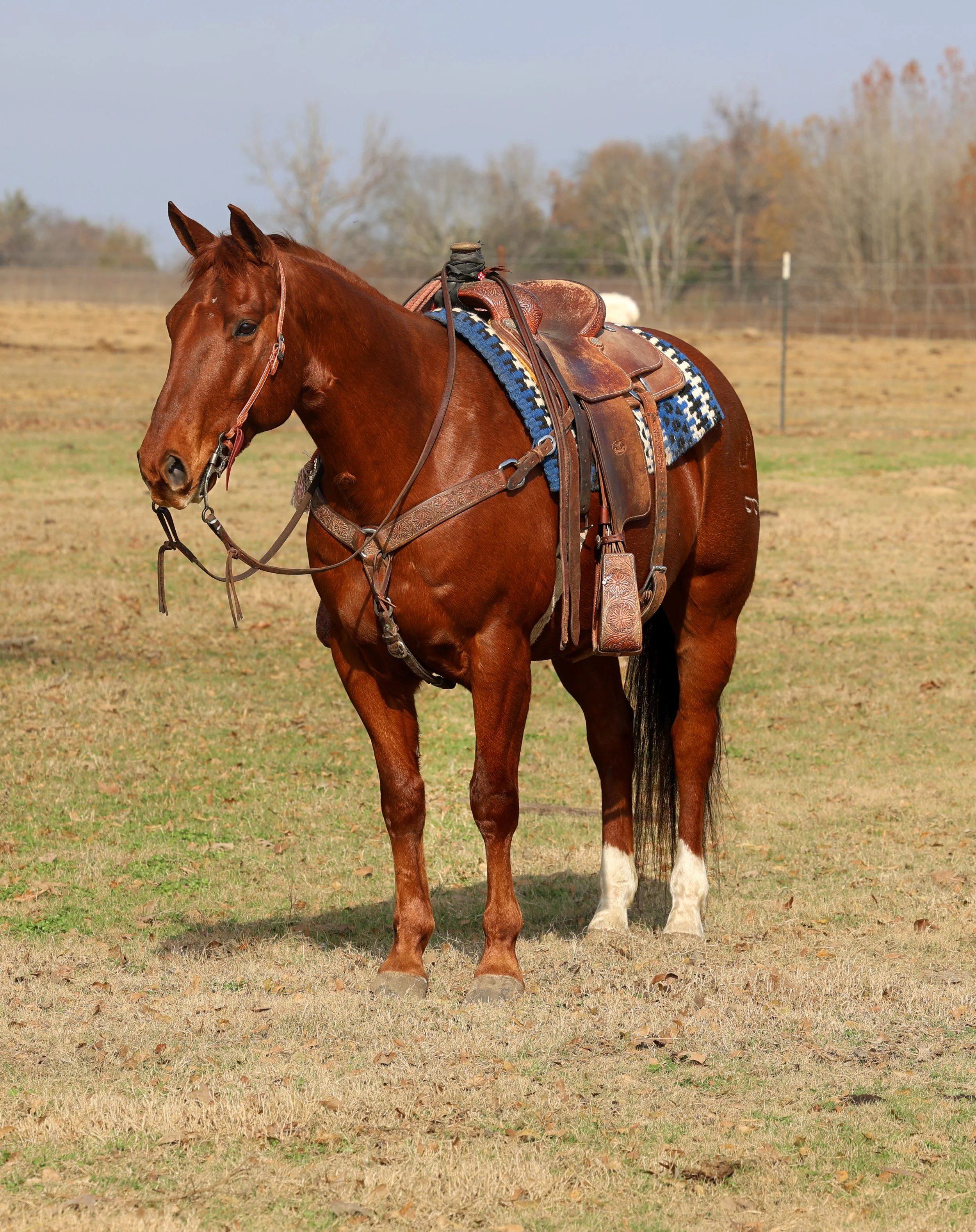 Rosa is a talented, gorgeous and built to perform. Standing 15 hands and weighing 1,200 pounds, she is balanced, athletic, and strong; making her standout in everything she does. She handles pressure with a quiet, willing attitude, making her a reliable partner in a wide range of settings. Rosa is an absolute lady to be around—quiet, friendly, and easy to handle. She is uncomplicated and easy to ride, giving her rider confidence while still offering plenty of try and responsiveness. She has a strong reining foundation with correct, stylish spins and a fabulous, effortless stop that leaves clean 11s in the pen. Her training allows her to stay soft, honest, and consistent every ride. What truly sets Rosa apart is how cowy and quick-footed she is. She has natural feel, timing, and awareness on cattle, making her lots of fun in the roping pen. She is coming along quickly and shows natural rate, willingness, and a calm approach. Rosa is great outside gathering cattle, where she travels willingly, stays focused, and works with purpose. Rosa has been with us for the past year, and we have truly enjoyed having her in our program. She is equally suited for the arena, the ranch, or as a future broodmare.
