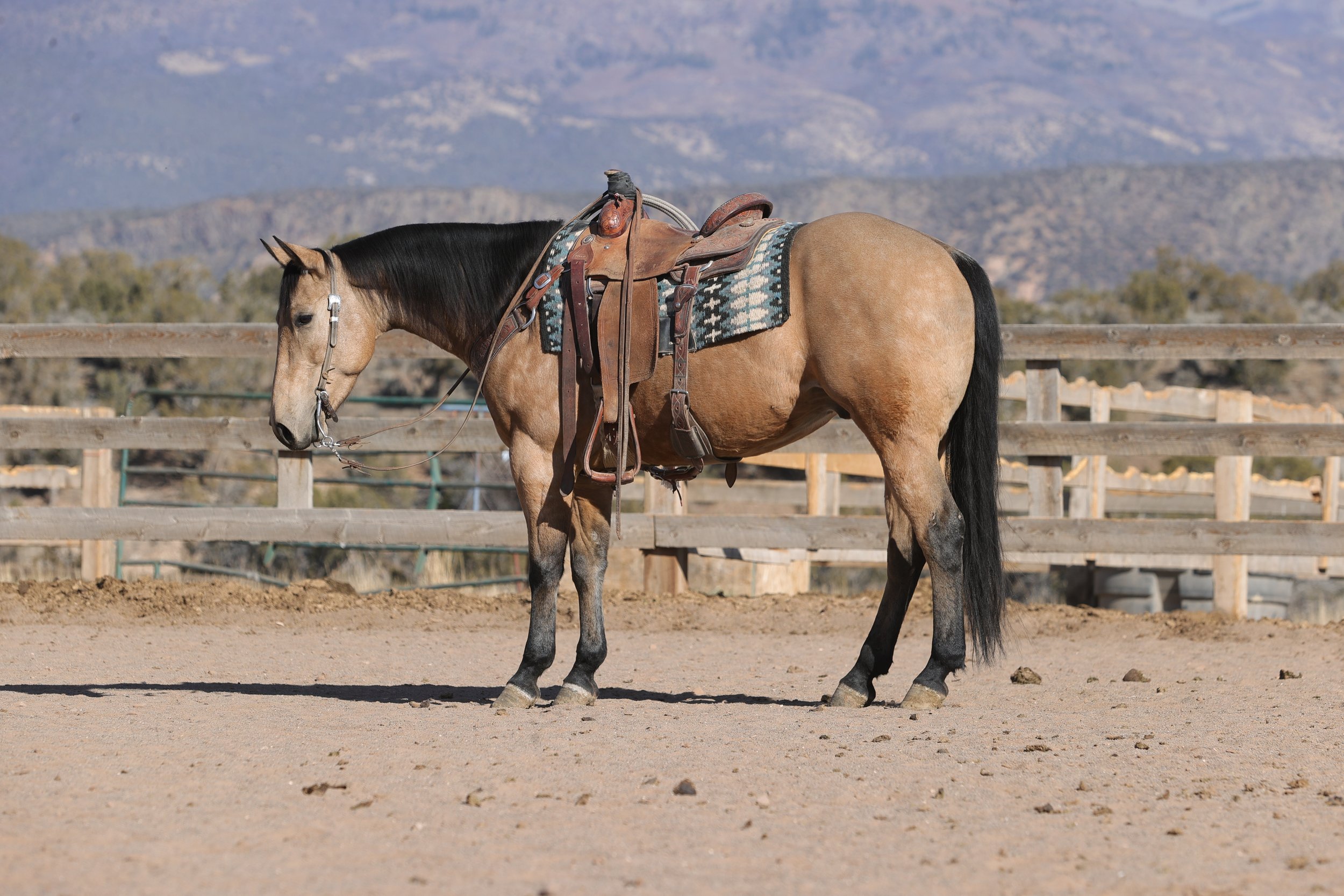 Flame is a sharp-looking 6-year-old buckskin gelding standing 14.3 hh, and he’s the kind that turns heads everywhere he goes! Flame is handy, willing, and well-rounded, and is a solid heel horse with ranch-rodeo experience and countless miles under saddle. he’s been ridden extensively both outside and in the arena, and he truly shines in the big country. Flame has gathered cattle in high country terrain, crossed water without hesitation, and covered plenty of trail miles with confidence. He’s been roped off more times than we can count, both in the branding pen and outside, and he always handles a rope calm, steady, and sure-footed. Flame is the dependable type the whole family can enjoy. Our 9- and 6-year-old sons love riding him, and they’ve spent plenty of time roping the dummy on his back. If you’re looking for a trustworthy, good-minded gelding with real experience and eye appeal, Flame fits the bill.