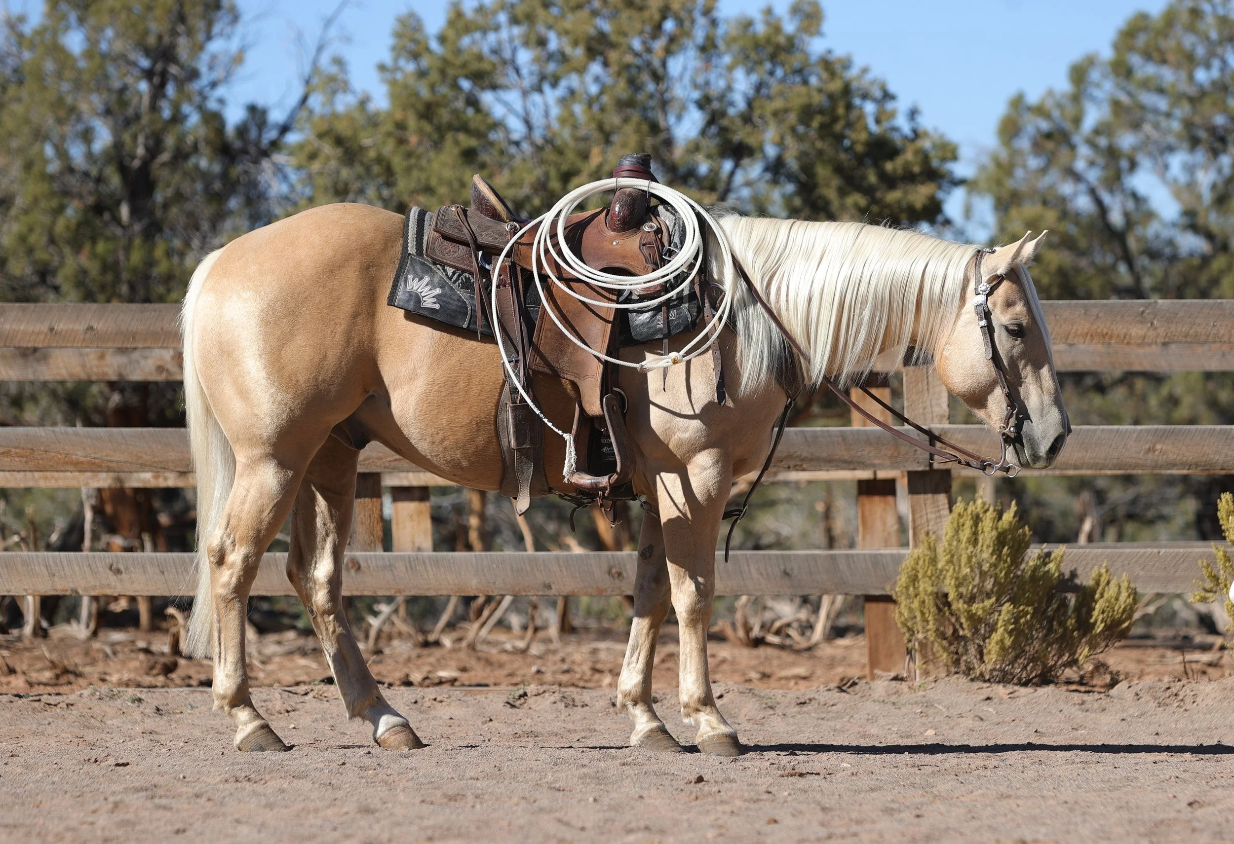 This stunning palomino gelding, Tucson, stands 14.3 hands tall, is VERY broke, and has all the fancy stops and spins. This horse is an athlete and naturally wants to do everything correct. With his talent and ability, Tucson is an excellent prospect for the rope horse futurities. With his talent and ability, Tucson is an excellent prospect for the rope horse futurities. He has been hauled to jackpots and is ready to take you to the pay window, while also being dependable enough to enjoy outside, whether riding in the mountains or working around cattle.