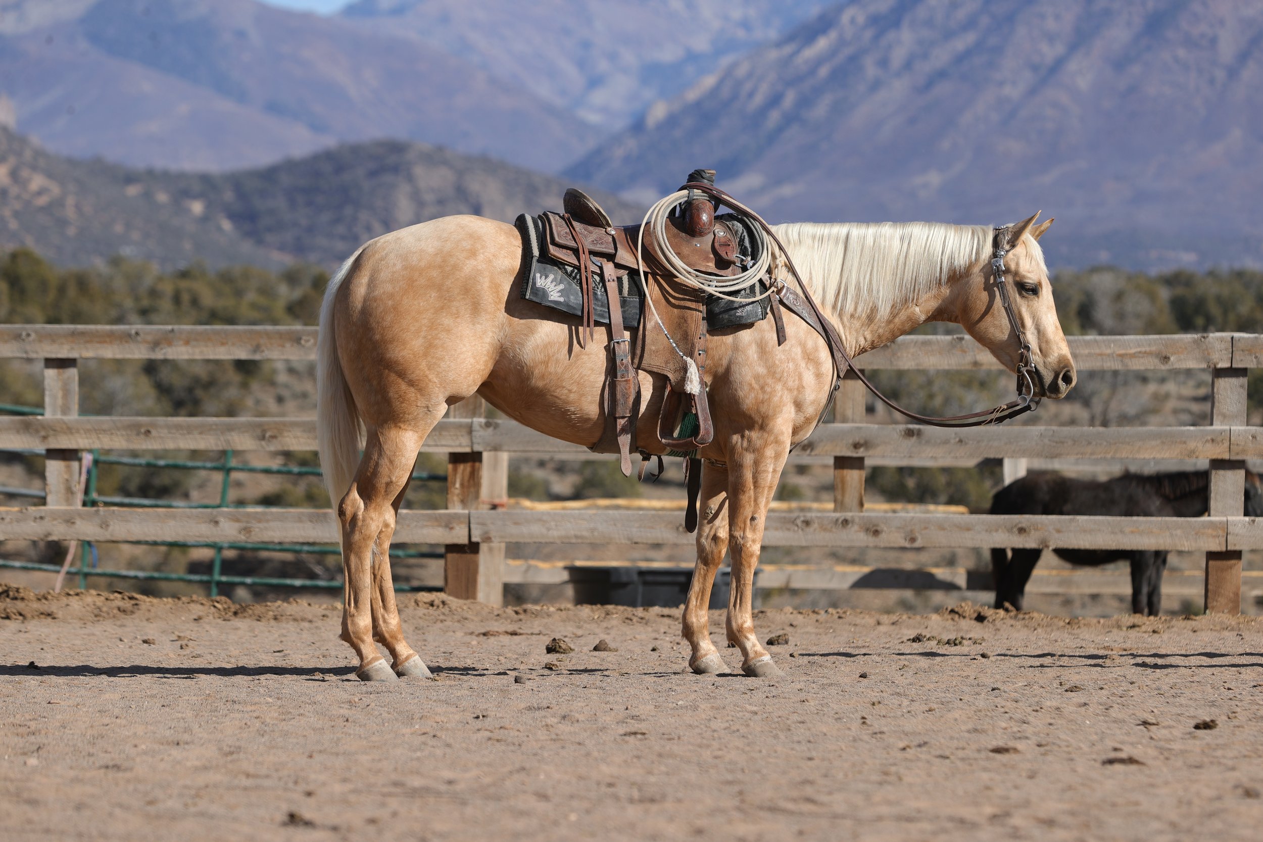 Flame is a sharp-looking 6-year-old buckskin gelding standing 14.3 hh, and he’s the kind that turns heads everywhere he goes! Flame is handy, willing, and well-rounded, and is a solid heel horse with ranch-rodeo experience and countless miles under saddle. he’s been ridden extensively both outside and in the arena, and he truly shines in the big country. Flame has gathered cattle in high country terrain, crossed water without hesitation, and covered plenty of trail miles with confidence. He’s been roped off more times than we can count, both in the branding pen and outside, and he always handles a rope calm, steady, and sure-footed. Flame is the dependable type the whole family can enjoy. Our 9- and 6-year-old sons love riding him, and they’ve spent plenty of time roping the dummy on his back. If you’re looking for a trustworthy, good-minded gelding with real experience and eye appeal, Flame fits the bill.