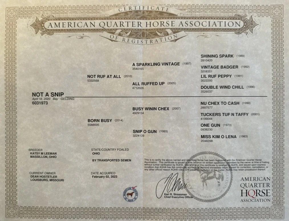 Not A Snip is a burley 2020 AQHA Bay Gelding by the Famous Reining Sire NOT RUF AT ALL who won the triple crown of reining. He’s 15 hands tall, super quiet, and has done everything we asked him to do. “Tyson" would be great at Versatility Ranch Horse, Ranch Riding, Roping (Head Horse), Trail Riding, or a Ranch Horse. He’s been ridden and enjoyed for the past year by a 73 year old man and his wife. He is a perfect gentleman to clip, shoe, haul, bath and absolutely whatever you ask him to do. He spent last winter in Arizona roping with the husband and trail riding in the desert with the wife. He stands in the box quiet and rates excellent as a head horse. He’s been brave on all obstacle challenges he has been introduced to.